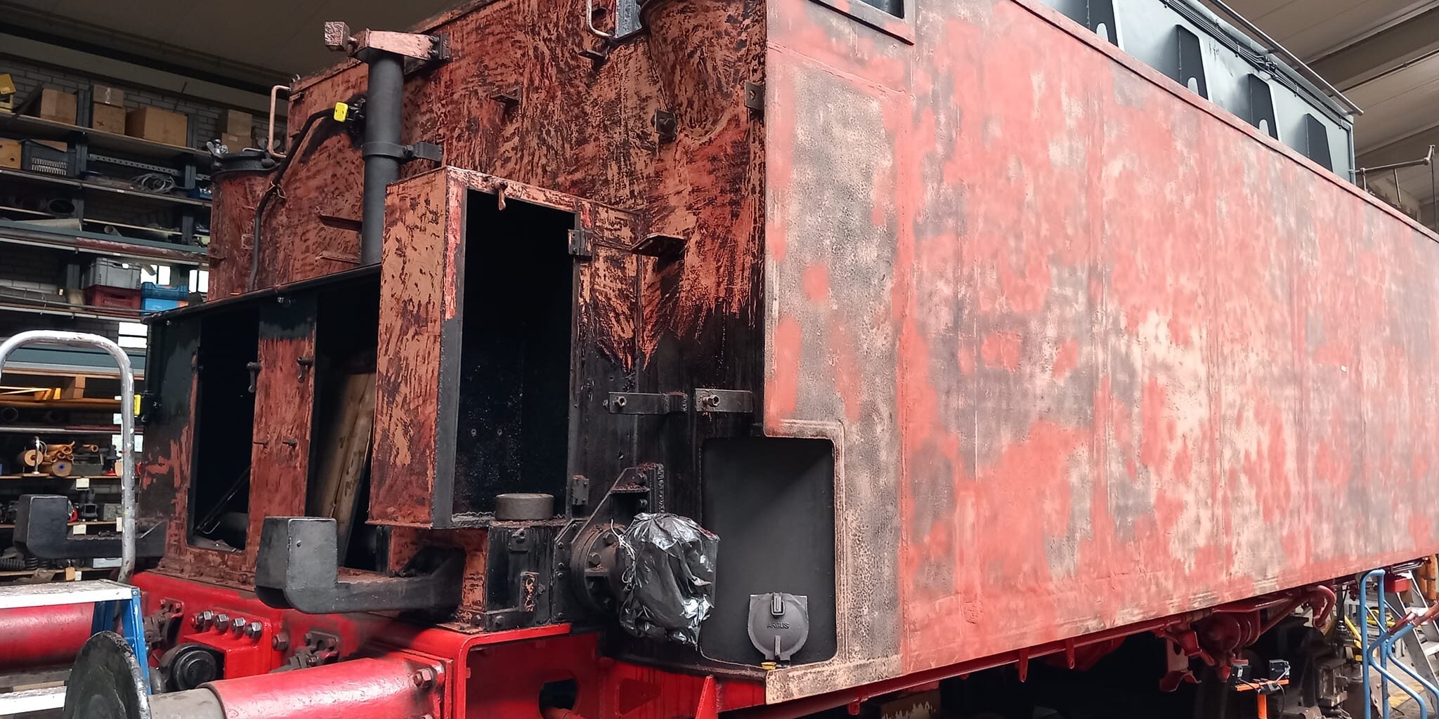 De tender is ontdaan van de oude verflagen en staat klaar voor het aanbrengen van een nieuwe zwarte laag.