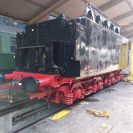 Daarnaast zijn de tenderkastjes inwendig grondig gereinigd en waar nodig ontdaan van stookolieresten uit de DB-tijd. Zodoende kunnen deze ook weer een mooie verflaag krijgen. Aan de buitenkant vordert het zwarte schilderwerk gestaag, waardoor één kant al een prachtig aanzicht biedt. Desondanks moet er hier ook nog het één en ander aan schilderwerk gebeuren. Vervolgens moet de reeds inwendig gereinigde oliebak aangepakt worden; Naar verwachting zit daar weinig werk aan. Daarna kan de oliebak in de tender worden gehesen en kunnen alle kleinere onderdelen worden teruggeplaatst. Zo nadert de voltooiing van de tender met rasse schreden.